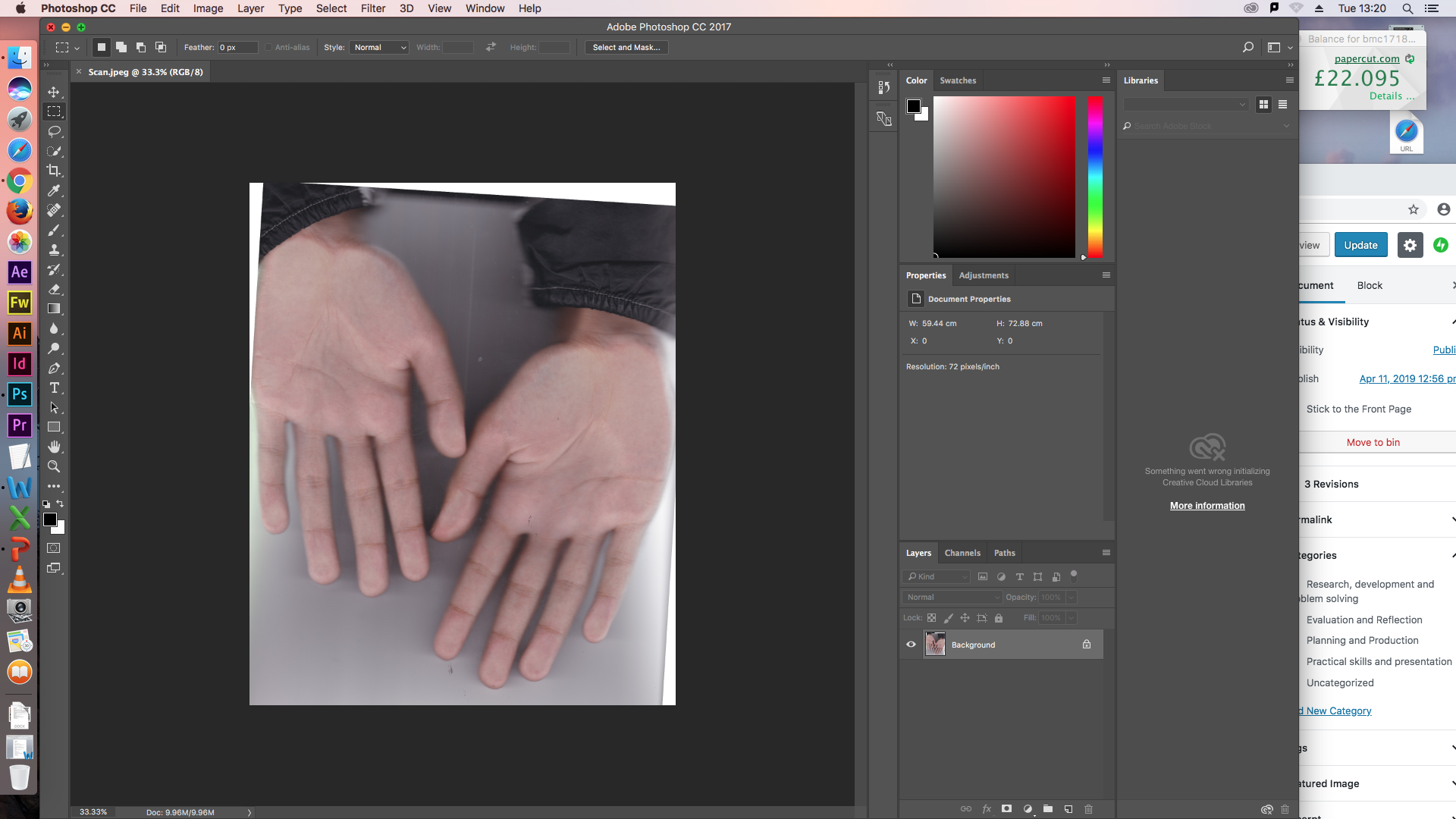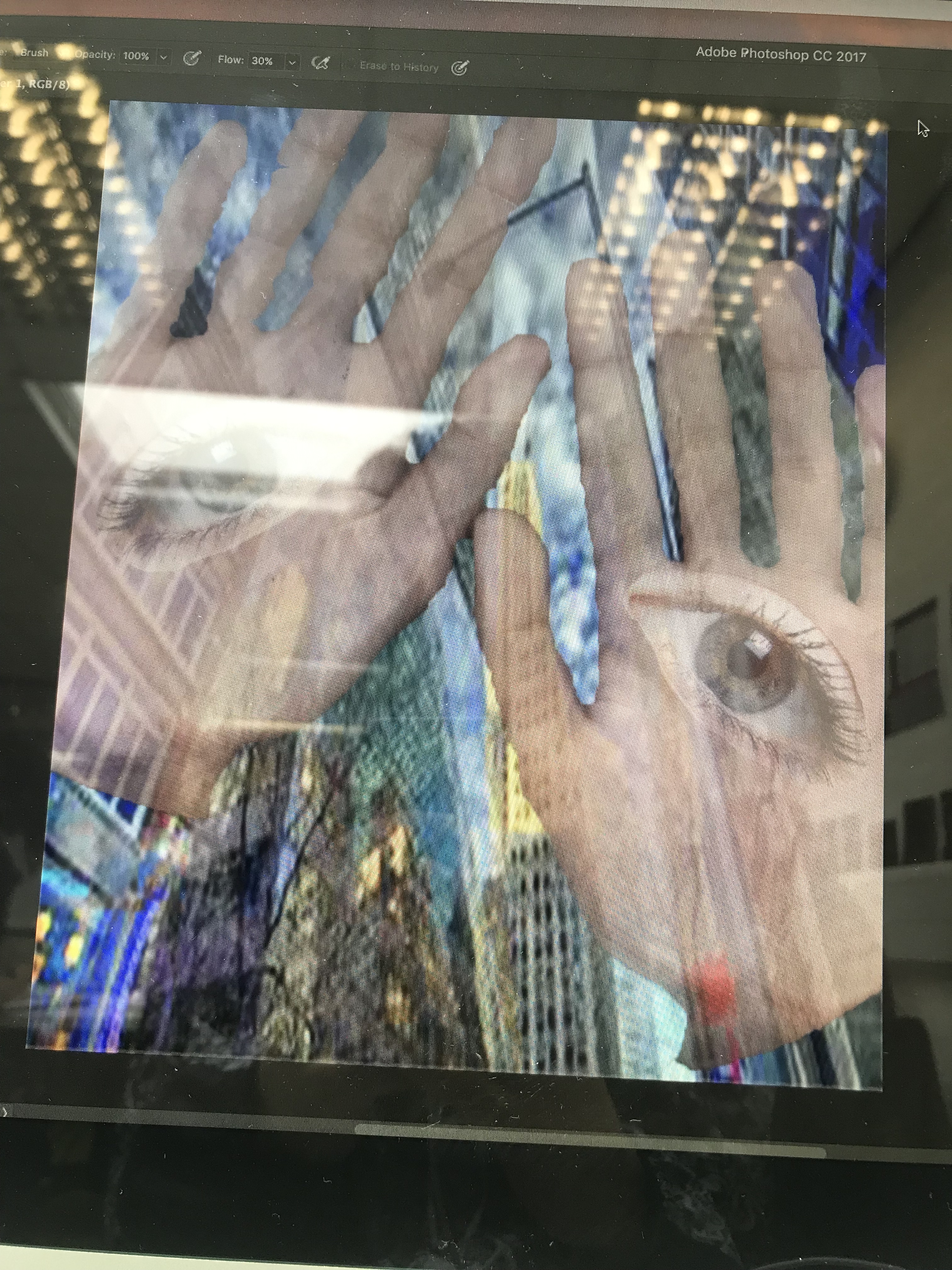 I first used a scanner to scan my hands into photoshop. I then looked for a City landscape image for my background as Hausmann tends to use these types of pictures for his backgrounds. After i found a image of an eye and duplicated it to go on each hand as Hausmann has a photomontage of eyes in hands and I wanted to recreate it. I also changed the Opacity to make the montage more visible and also I used the rubber tool in Photoshop to cut out the eye. I used the Quick Selection Tool to delete the initial background of my hands when i firsts scanned them so I could add the cityscape image as the background instead. My first thought was that as a first attempt it wasn’t bad, to improve it i could’ve chose a better selection and cut out my hands and the eyes more accurately.
